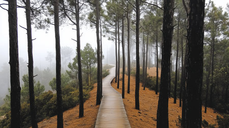A winding trail meanders through a misty forest inviting adventurers to embark on a journey amidst lush greenery. The warm tones create a tranquil atmosphere perfect for reflection.