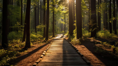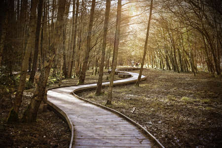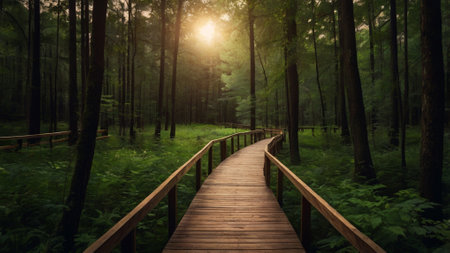 Wooden walkway in a green forest at sunset. Nature background