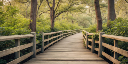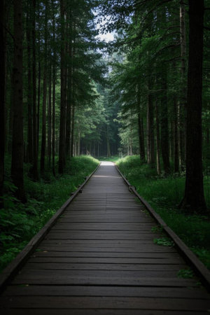 Discover a beautiful wooden pathway meandering through a vibrant green forest, inviting nature enthusiasts to explore the calm and serene wilderness all around.