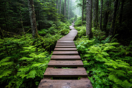 Scenic boardwalk trail meanders through tall pine trees and lush green ferns in a vibrant forest setting, perfect for nature walks and exploration.