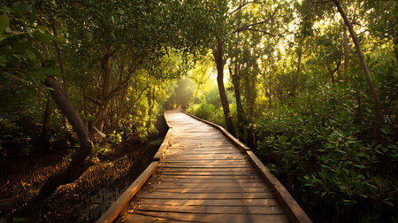 Wooden boardwalk leading into a mangrove forest. Dense trees on either side with sunlight filtering through the foliage creating a golden hour effect.