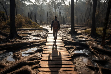 Exploring Nature's Path: A Male Hiker Ventures Across a Protective Wooden Deck