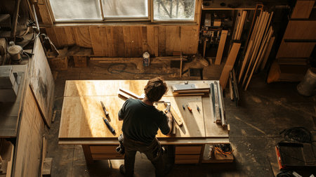 Woodworker creating a handcrafted project in a cozy workshop surrounded by tools