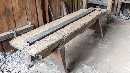 A rustic wooden workbench with a weathered surface, featuring a central metal strip, set in a traditional workshop. Perfect for showcasing craftsmanship.