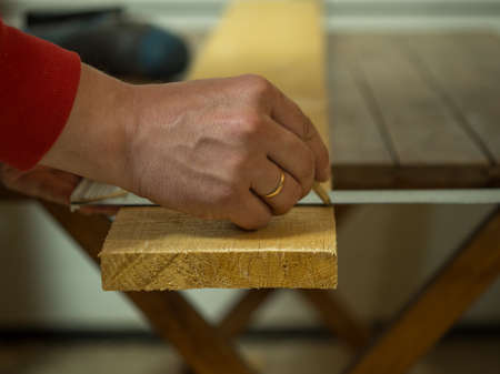 the carpenter measures and marks the wood in the workshop to cut