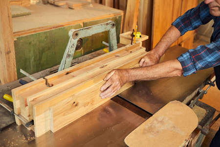 Senior experienced carpenter in plaid shirt putting pine wooden board in thickness planer on workbench