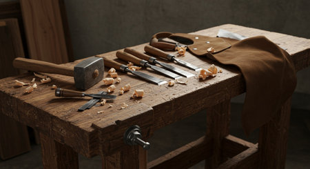 Tools are arranged on a rough wooden table in a workshop. Warm light highlights the handmade craftsmanship and rustic setting.