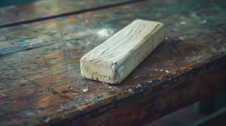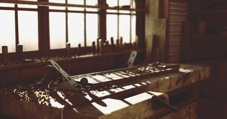 Wooden workbench with worn tools rests in a rustic workshop. Natural light streams in, highlighting the unique character and history of the space.