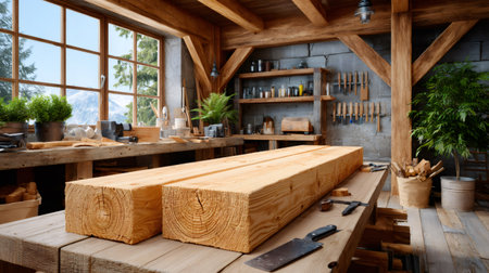 A well-crafted wooden workbench set in a rustic workshop filled with various tools and equipment. The inviting space showcases creativity and craftsmanship.