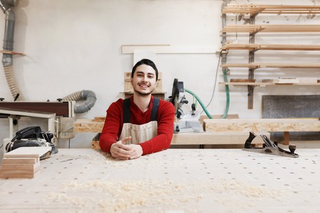 Young handsome joiner working with wood in his carpentry workshop