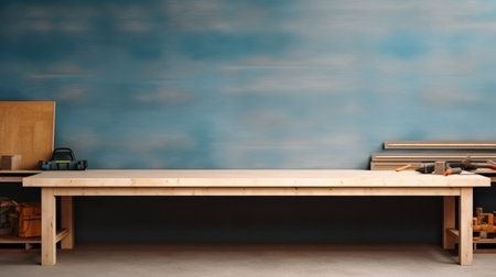 Carpentry workshop spacious studio with wooden table. Horizontal indoor background with copy space. AI generative image.