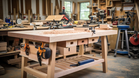 carpentry workshop with various tools and materials for creating custom furniture, created with generative ai