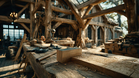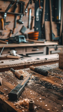 A detailed view of a rustic workshop filled with various tools and woodworking materials, showcasing the craftsmanship and warm, inviting atmosphere of artisan creation.