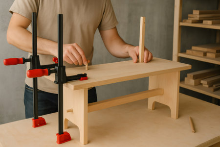 Carpenter carefully assembling small wooden bench using clamps and dowels in his bright workshop