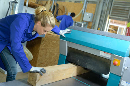 Carpenter working on woodworking machines in carpentry shop. woman works in a carpentry shop.