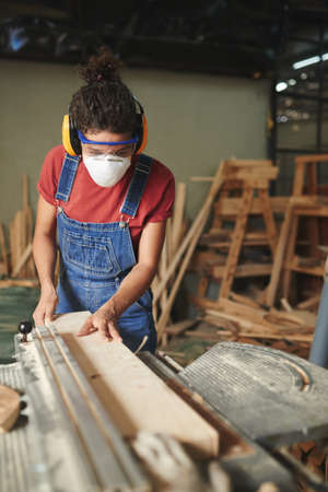 Concentrated young woman in safety glasses, mask and earmuffs cutting wooden board on table saw
