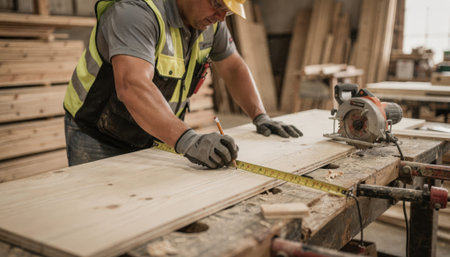 Worker measuring and cutting plywood sheets with accuracy foreground sharply detailed against a background of outoffocus construction materials.