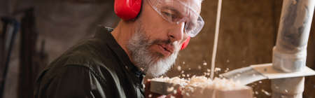 mature carpenter in goggles blowing sawdust from wooden plank, banner