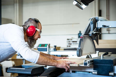 Carpenter man using Electric Wood Cutter machine with protection safety equipments in wood workshop