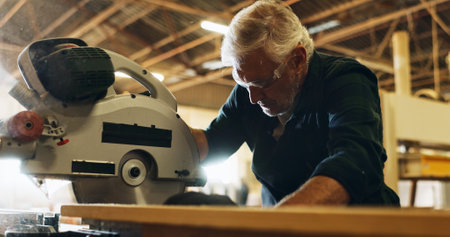 Carpenter, man and machine with wood in workshop, diy manufacturing and production business. Factory, mature person and contractor with saw tools for furniture service, maintenance and cutting plank