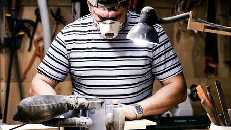 Senior craftsman with face mask and visor because of Covid-19 in the workshop