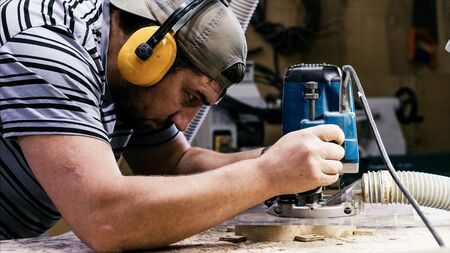 DIY woodworking and furniture making and craftsmanship and handwork concept. Carpenter working on woodworking machines in carpentry shop. Young man working as carpenter and taking wood stock.