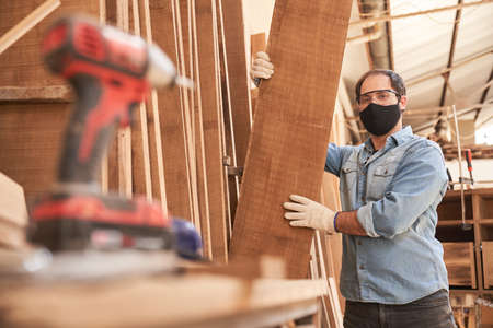 Craftsman as a carpenter with face mask because of pandemic in the joiner's wood store