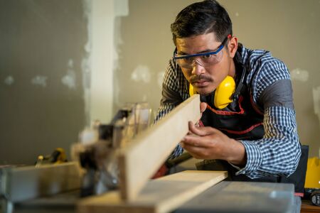 Young man in doing some carpentry work. Asian men carpenter using a saw to cut wood for his home.