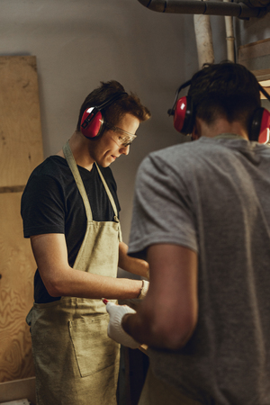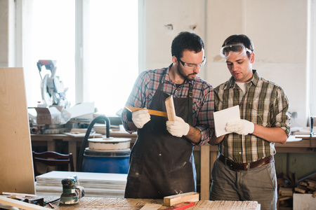 Two carpenters at the table with tools at the production . Woodworkers at the production site.
