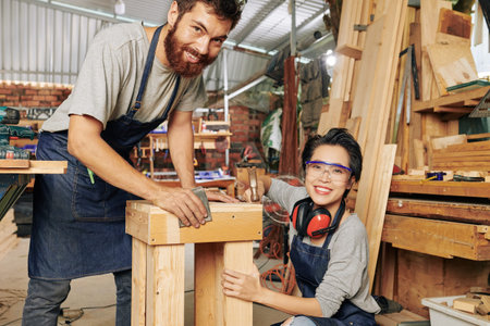 Multi-ethnic team of cheerful carpenters working on wooden stool in workshop