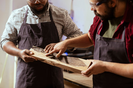 Woodworker holding timber block, showing workshop partner improvements to be made. Manufacturer pointing to apprentice defects in piece of wood to be fixed, close up shot