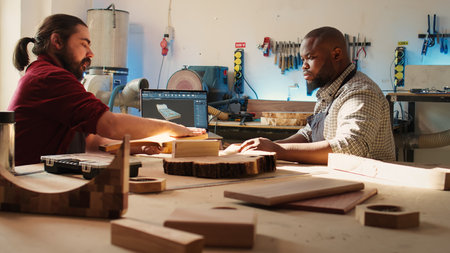Woodworker looking over blueprints on laptop, brainstorming with colleague next steps in wood processing. Manufacturer and BIPOC apprentice reading furniture assembly schematics in studio, camera B