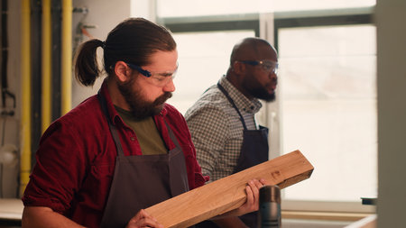 Carpenter selecting quality wood materials, ensuring they align with project requirements. Cabinetmaker doing quality assurance on lumber block in furniture assembling shop, camera A