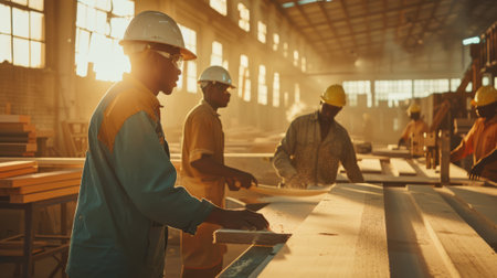 A group of skilled construction workers is actively engaged in the process of cutting wood inside a large manufacturing factory setting