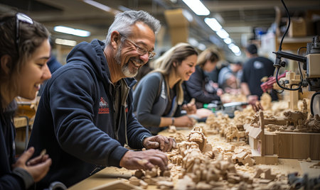 A group of diverse workers, both young and older, working together in a lumberyard. They demonstrate teamwork, collaboration, and skills development in a workshop environment, highlighting mentorship and apprenticeship.