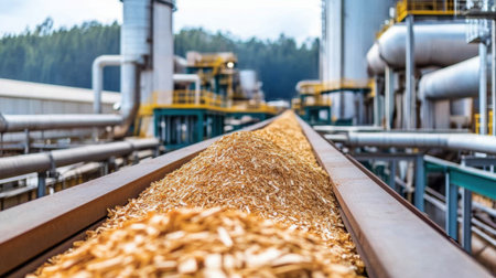 This image showcases an industrial processing plant with a focus on a conveyor belt transporting wood chips, highlighting modern biofuel production techniques.