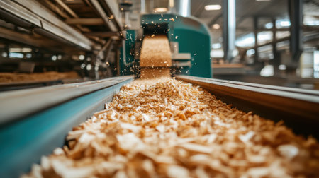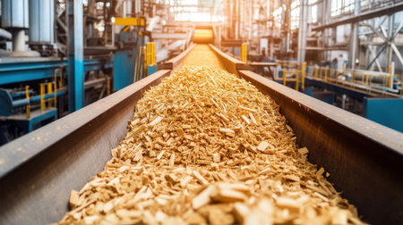 Close-up view of wood chips on a conveyor in an industrial facility focused on biomass energy production and wood recycling, showcasing technology and sustainability.