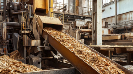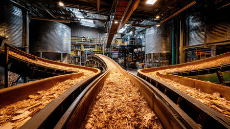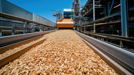 A conveyor belt loaded with wood chips showcases the industrial process of material transport in a modern processing facility. This image highlights efficiency and innovation.