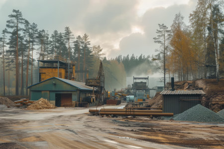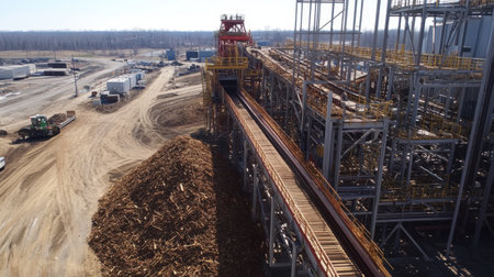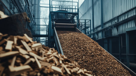 This image showcases a detailed view of an industrial wood processing facility, highlighting machinery with a conveyor system transporting wood chips and sawdust.