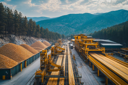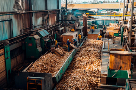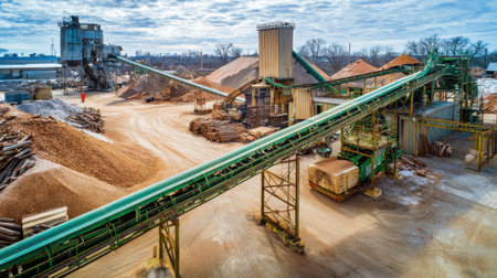 This image showcases an industrial wood processing facility where conveyor belts efficiently transport wood chips and sawdust. The intricate setup highlights modern manufacturing techniques and the scale of machinery used in the production process. The scene reflects a busy work environment with a focus on logistical efficiency and resource management.