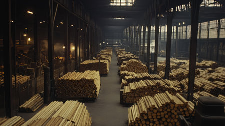 Captivating view of a rustic lumber yard showcasing stacks of logs in a spacious storage area. Industrial architecture enhances the raw materials atmosphere.