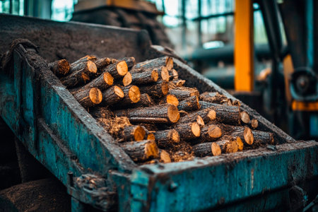 conveyor belt carrying wood chips for paper production, created with generative ai