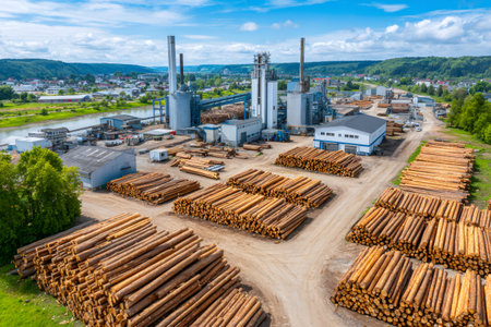 A vast industrial wood processing plant showcasing logs and machinery, highlighting the intricate workflow of timber preparation and processing in a modern facility.