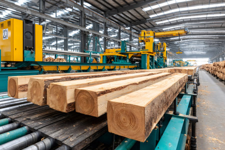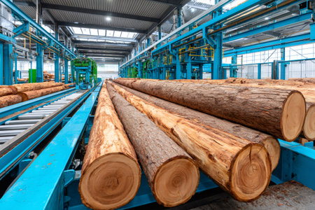 View of logs and timber in an industrial warehouse, showcasing modern machinery and processing equipment. The scene highlights wood as a vital raw material.