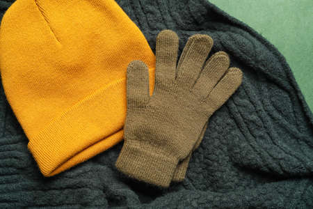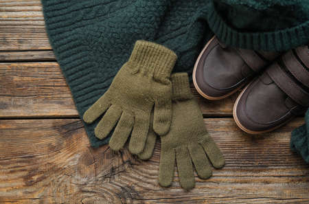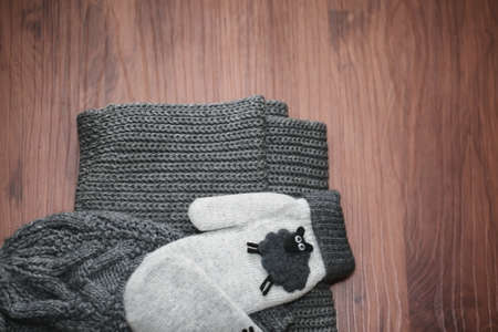 Woolen gloves and shawl or scarf for woman, warm clothing for autumn or winter concept