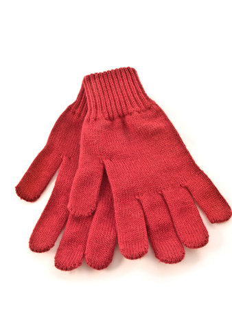 A pair of soft pink wool gloves placed on a white background. Warmth, comfort and protection during the cold season