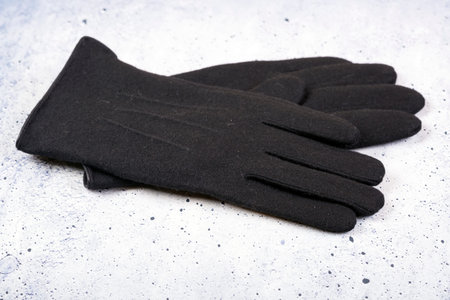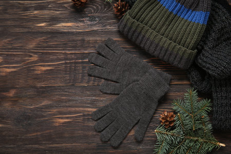 Warm woolen mittens of dark color on a light wooden background. Winter clothing and accessory. Flat lay, top view. High quality photo