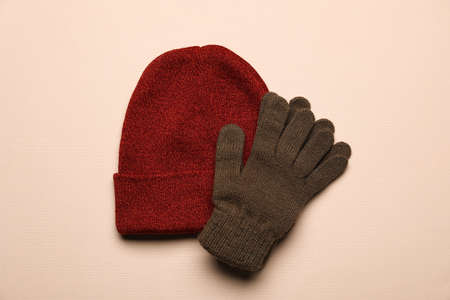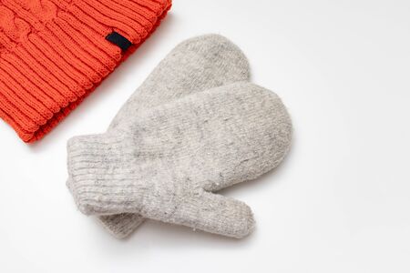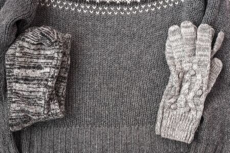 Warm female gray knitted gloves, socks on sweater textured background. Flat lay, top view minimal fashion concept.