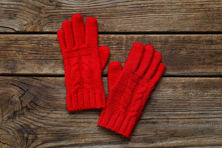 Warm woolen winter mittens on a colored wooden background. Top view, flat lay.
