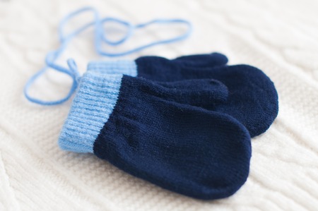 Pair of blue knitted mittens on a white woolen fabric. Winter background.